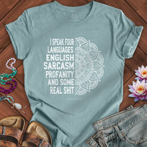 Funny Spiritual Mandala Tee – “I Speak Four Languages” Bold Graphic Shirt for Sarcastic Souls – Lotus Moon