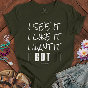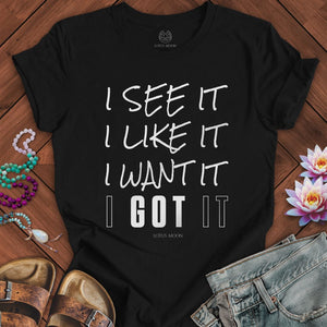 Featuring the mantra “I see it, I like it, I want it, I got it,” this design celebrates desire, self-trust, and the art of manifesting with confidence. Its bold, feminine typography reflects the power of claiming your worth and calling in your dreams. Perfect for women who lead with clarity, intention, and unstoppable vision, this tee is a wearable affirmation of your manifesting magic.