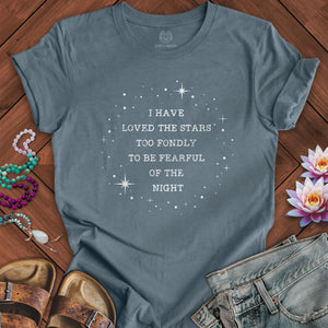 The Star Love Tee whispers a message of courage and wonder, drawn from the stars themselves. Encircled by a halo of twinkling lights, the timeless phrase "I Have Loved The Stars Too Fondly To Be Fearful Of The Night" invites you to embrace the mysteries of the dark with an open heart. Perfect for cosmic dreamers, moonlight wanderers, and anyone who finds their strength among the stars.